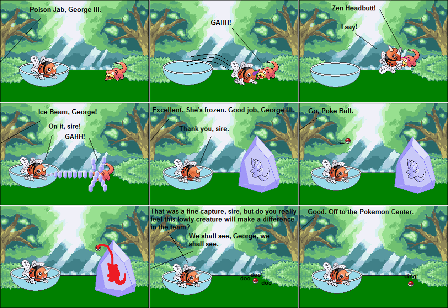 Nevertheless, i continued spriting, and my skills grew, if you can even say that about a non-art. I tried several failed comics, even one to parallel Danny Teach, but then one day, a little while after joining Bulbagarden, I created the first of what I like to think of as my best comic. I actually checked the spelling on these, and stopped pasting the group as a group and started pasting individually. The plot, I thought at least, was rather good, and I liked it, so, here it is.