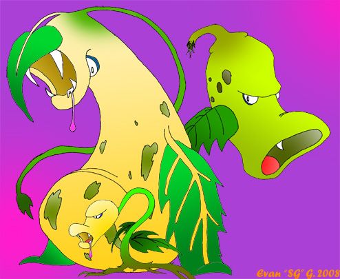 This picture was me trying to draw the Bellsprout evolution line in my own style, as part of a series of sketches I was working on called "Version Exclusive." The shading's a little wonky (I'm more comfortable with traditional media than Photoshop I guess), but otherwise I'm quite fond of it.